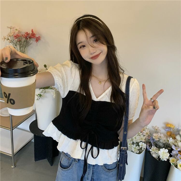 ドッキングデザインブラウス レディース レディースファッション トップス ブラウス ドッキング シャツ カジュアルブラウス Vネック 半袖 袖あり バイカラー ワンサイズ フリーサイズ ゆったり ショート丈 短め ラフ 春 夏 サマー 女性用 ルーズ 大人可愛い 可愛い カジュアル可愛い フェミニン 甘め 10代 20代 ハイウエスト きれいめ 上品 キュート 休日 ガーリー デート おでかけ 女子会 ランチ会 リゾート 無地 清楚 控え目 韓国 ファッション 通勤 通学 オフィススタイル