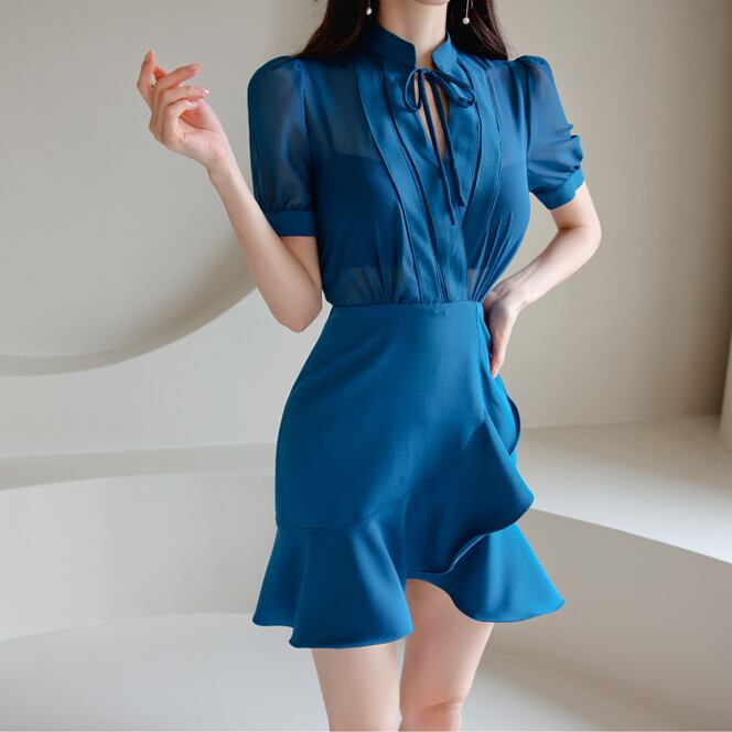 シフォンフリル ワンピース シアー素材 カシュクール ワンピ ミニ丈 ショート丈 パフスリーブ フリルスカート 裾フリル スタイルアップ セクシー 透け感 ワンピ 袖あり 半袖 スタンドカラー エレガント 上品 セクシー レトロ かわいい 大人可愛い おしゃれ フェミニン 大人女子 キュート ガーリー 抜け感 二次会 合コン 食事会 謝恩会 パーティ バレンタイン デート 春 夏 秋 誕生日 レディース 女性用 10代 20代 30代 40代 クラブ デート お出かけ OL 学生 女子会 レストラン 青