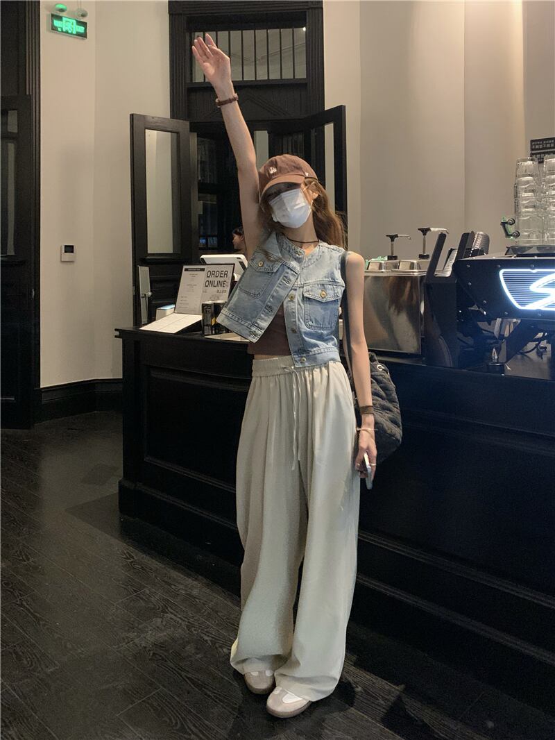 クロップド丈のデニムベストとストレートパンツのセットアップです。