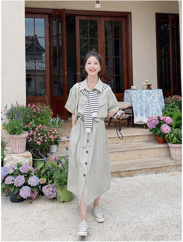 レディース ワンピース シャツワンピース フレアワンピース ロジスワンピ 送料無料 個性的 春服 夏服 ミモレ ロング 袖あり 五分袖 二の腕カバー 襟付き ポロカラー レギュラーカラー セミフレア スリム Aライン BIGシルエット 切り替えデザイン 前開き オーバーサイズ リボン ウエスト ポケット ボタン インスタ映え SNS 映え 写真 映え 高見え 体型カバー 着やせ 効果 韓国 オルチャン ベーシック シンプル ナチュラル カジュアル モダン おしゃれ こなれ感 抜け感 大人可愛い 春 夏
