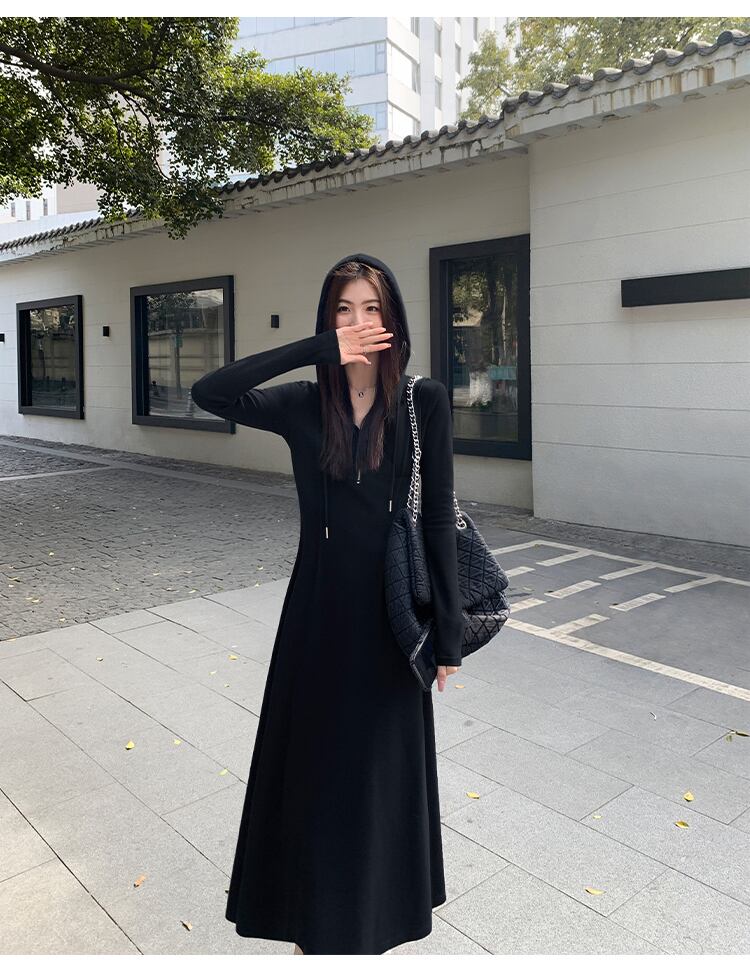 ワンピース レディース スウェットワンピ フレアワンピース ロジスワンピ 送料無料 個性的 秋服 冬服 マキシ丈 フルレングス 丈長 長袖 萌袖 Vネック セミフレア スリム タイト 細身 Aライン フード ファスナー INSスタイル インスタ映え SNS 映え 写真 映え 楽ちん 体型カバー 普段使い 日常使い デイリー 定番 韓国 オルチャン 無地 ベーシック シンプル ナチュラル カジュアル かわいい ガーリー きれいめ コンサバ モード系 クール かっこいい おしゃれ こなれ感 抜け感 大人可愛い