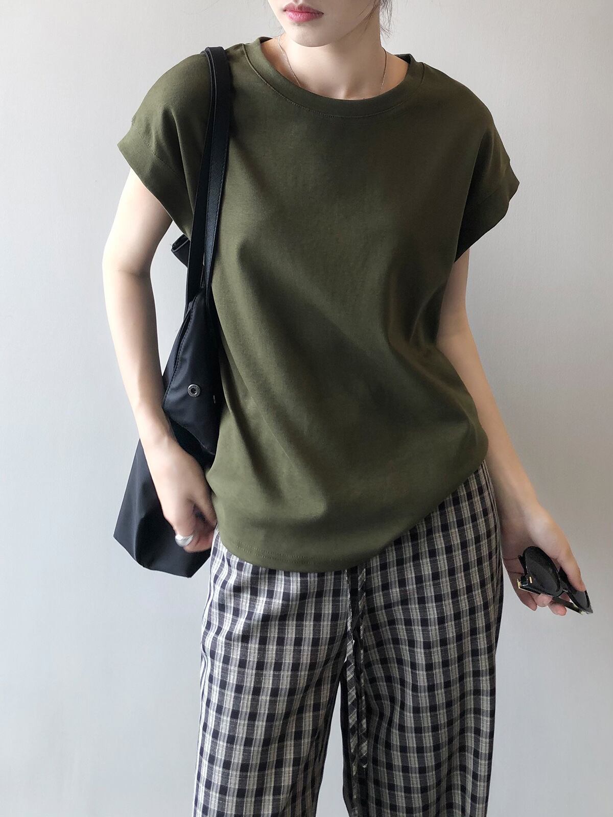 ラウンドネックの無地でシンプルなデザインのTシャツです。
