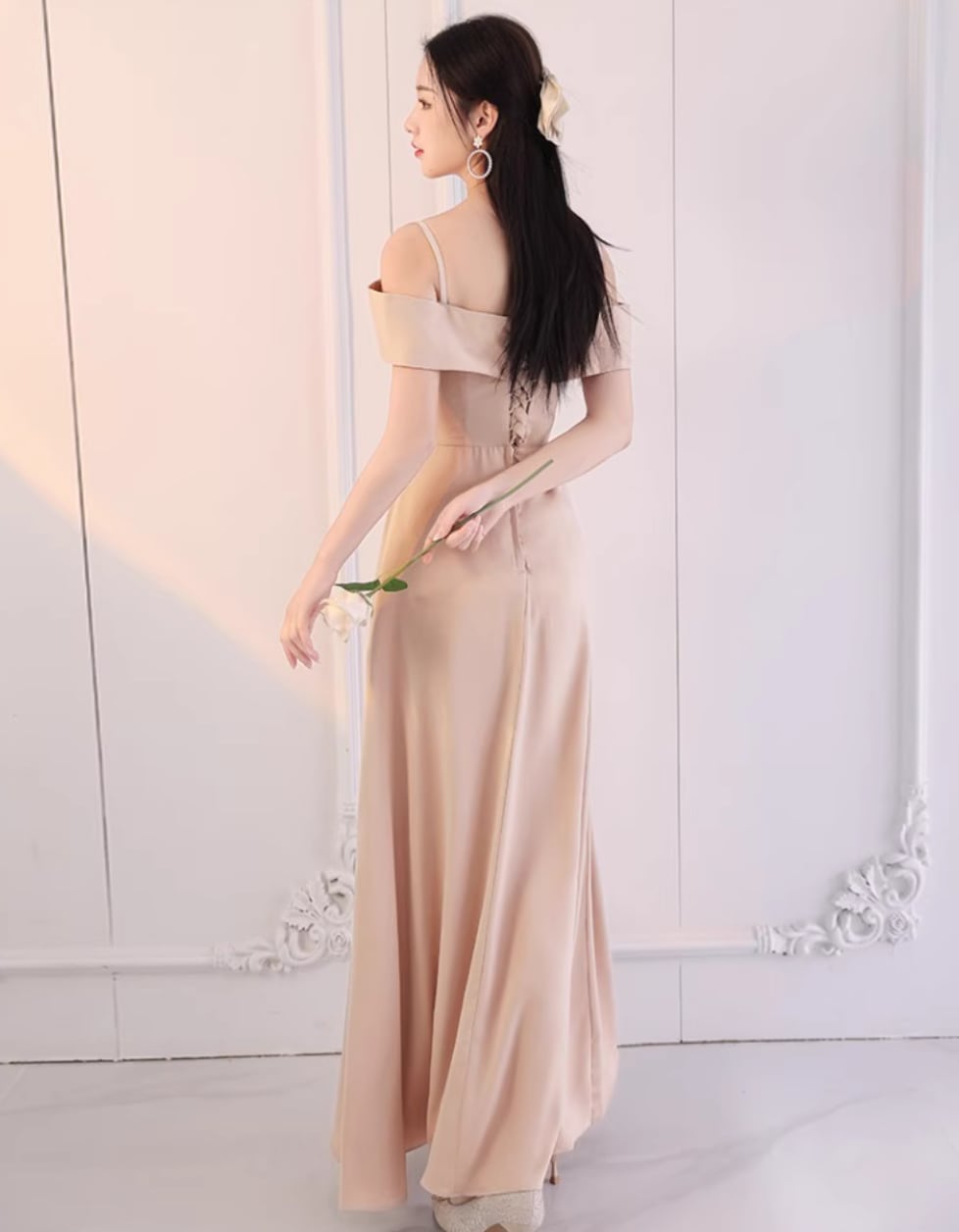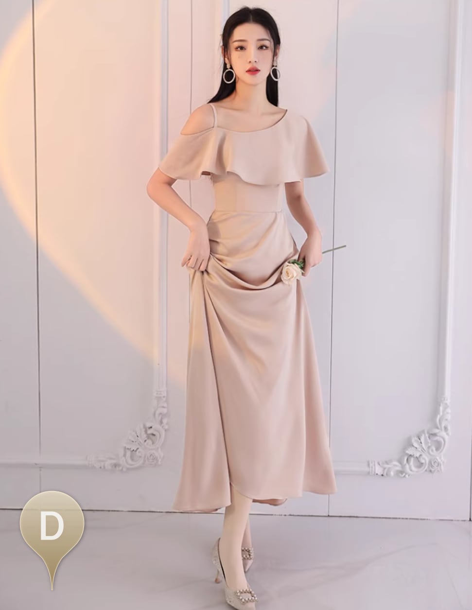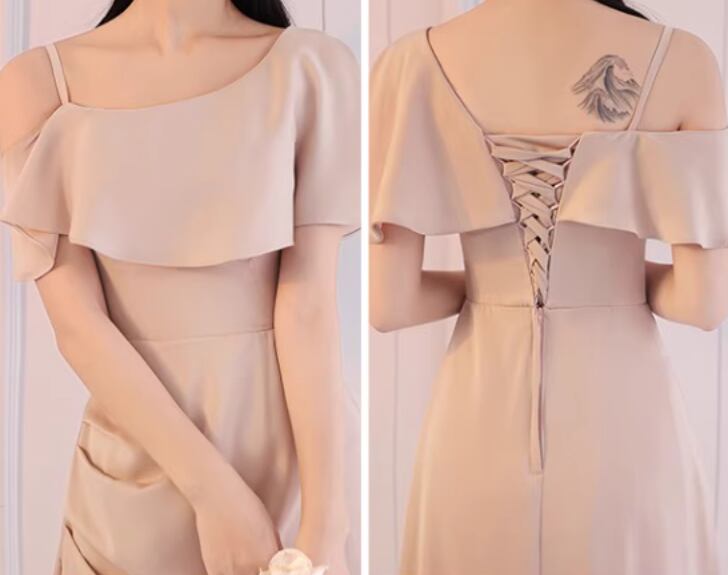 上品な見た目に加え、フリルやウエストマーク、バックリボン、バックコンシャス、編み込みなど、細部までこだわったディテールが魅力です。サテン風の生地が高級感と美脚効果を演出し、光沢感がさらなる華やかさをプラスしています。