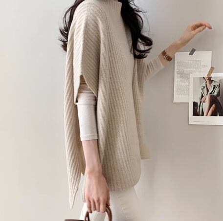 体型カバーに優れたケープデザインのマタニティニット。