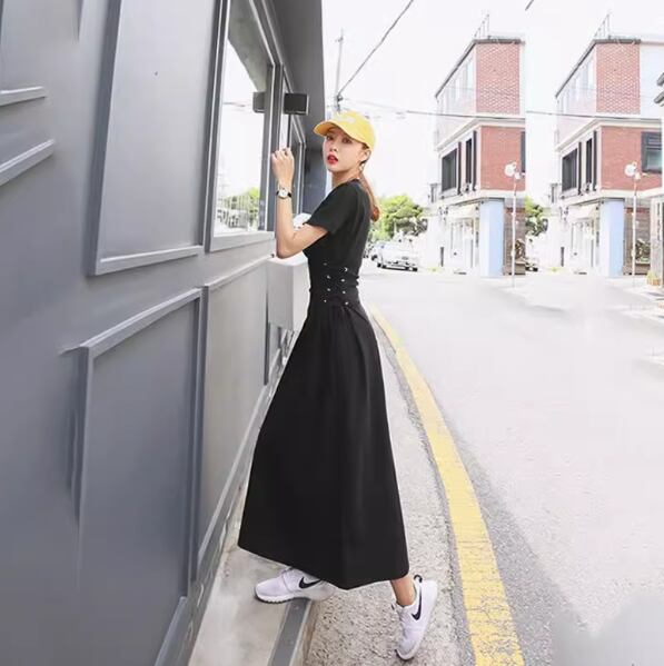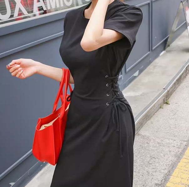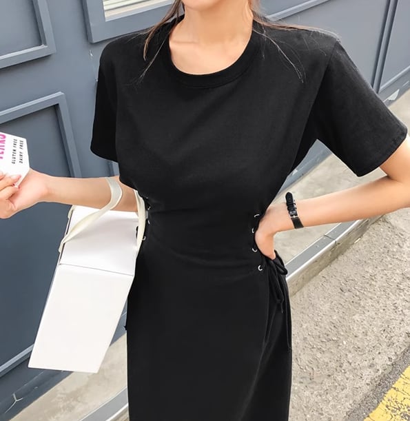ワンピース レディース カットソー プルオーバー スウェットワンピ 送料無料 個性的 ロング アンクル 半袖 ラウンドネック 細身 Iライン リボン サイド 横 レースアップ 細見え 着痩せ 効果 普段使い 日常使い 無地 ブラック M 2XL 綿 カジュアル キュート クール かっこいい ラフ おしゃれ 存在感 主役級 大人可愛い 爽やか 好感度 春 夏 インスタ映え SNS 映え 写真 映え デート お出かけ 休日 アクティブ リゾート 旅行 ライブ 外出 家着 OL 学生 女の子 10代 20代 3