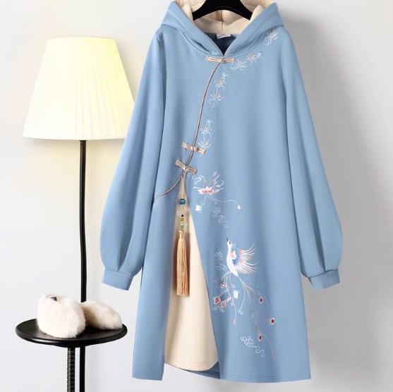 チャイナドレス Aライン ぽっこりお腹 ミモレ ワンピース ドレス レディース プルオーバー フーディー スウェット 送料無料 個性的 秋コーデ 冬コーデ ミディアム ミドル丈 長袖 ラウンドネック 襟なし フード 刺繍 ブルー 青色 ライトブルー 水色 柄あり 花柄 フラワー アニマル柄 サイズ豊富 M L XL(LL) 2XL(3L) 3XL(4L) 4XL(5L) 大きめ ビッグサイズ ゆったり 大きいサイズ 1枚で決まる 日常使い デイリー 人とかぶらない 目立つ 秋 冬 SNS 映え 学生