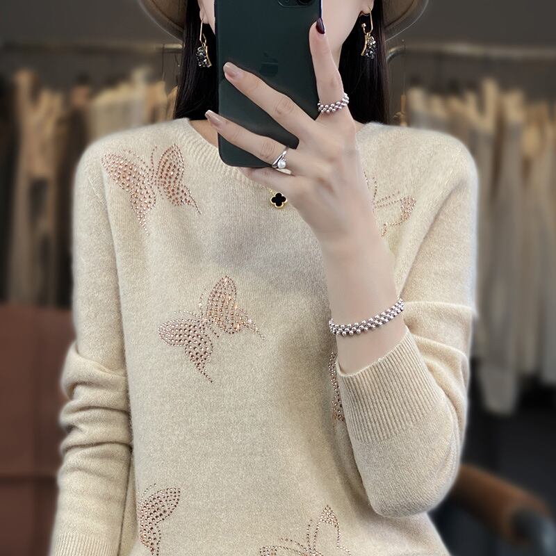 ニット セータートップス長丈トップス 長袖 レディース プルオーバー 個性的 秋 冬 ラウンドネック ビジュー カラバリあり グレー ホワイト ベージュ レッド グリーン ピンク ブラウン 柄あり 蝶 S M L XL LL ウール 旅行 カラオケ 外遊び 外出 1枚で決まる 普段使い 日常使い 定番 着回し デイリー 合わせやすい 暖かい ラフ おしゃれ こなれ感 存在感 主役級 好感度 20代 30代 40代 お迎えコーデ 宅飲み 女子会 休日 お出かけ インスタ映え SNS 映え 写真 映え
