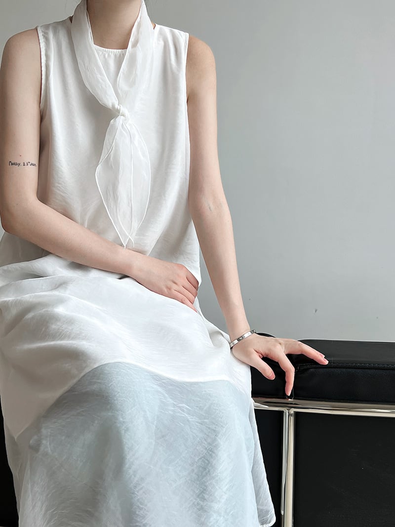 個性的で可愛らしいシアーワンピースが登場しました!春夏秋に活躍する、ミモレ丈の袖なしワンピースです。クルーネックのデザインに加え、リボンスカーフがアクセントになっています。セミフレアのスカート部分は、女性らしいシルエットを演出し、肩や腕を華奢に見せてくれます。透け感のある素材で、清楚で爽やかな印象を与える一着です。