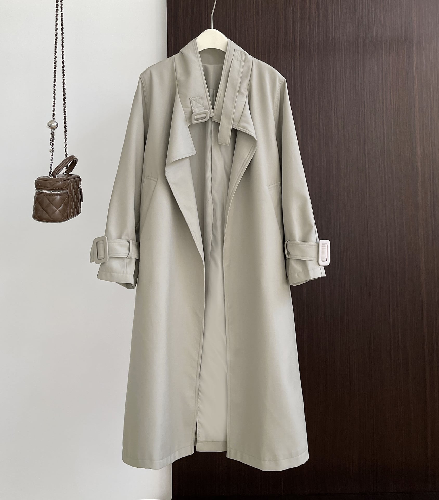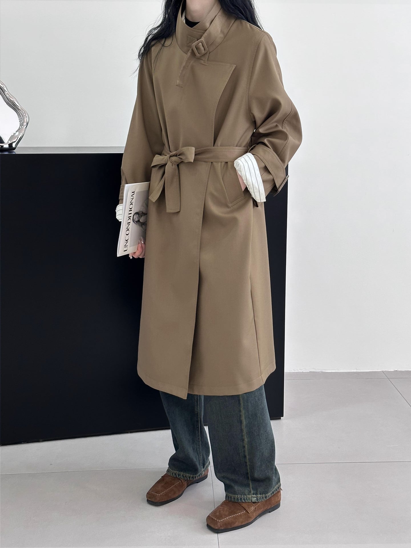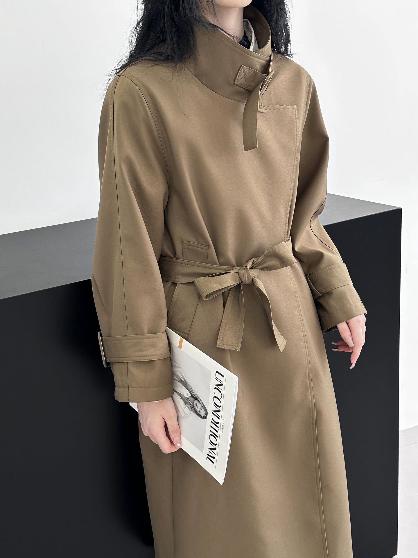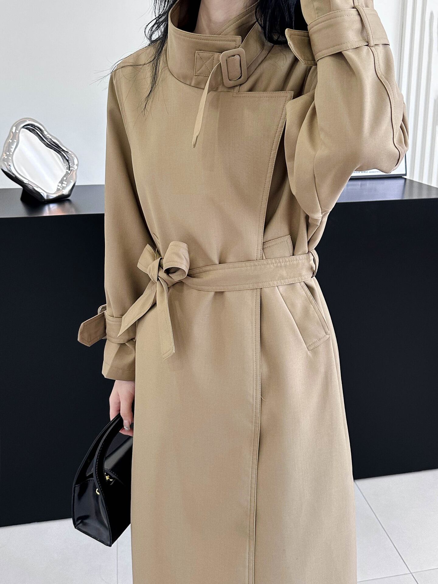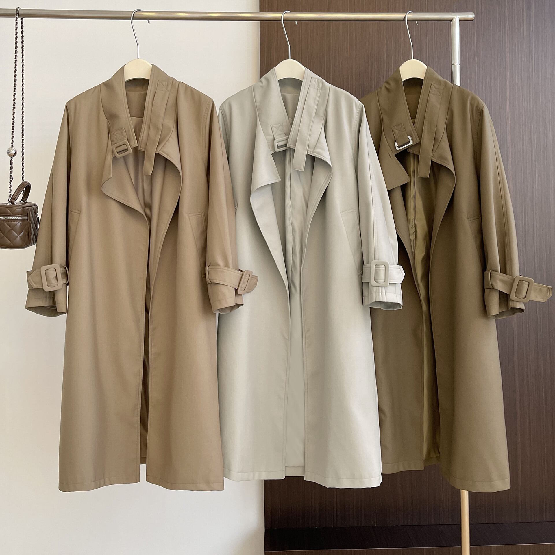 襟元を開いてラフに着用しても、首元を閉じてベルトをすればきっちりとした印象になるので、さまざまなシーンで着用いただけます。