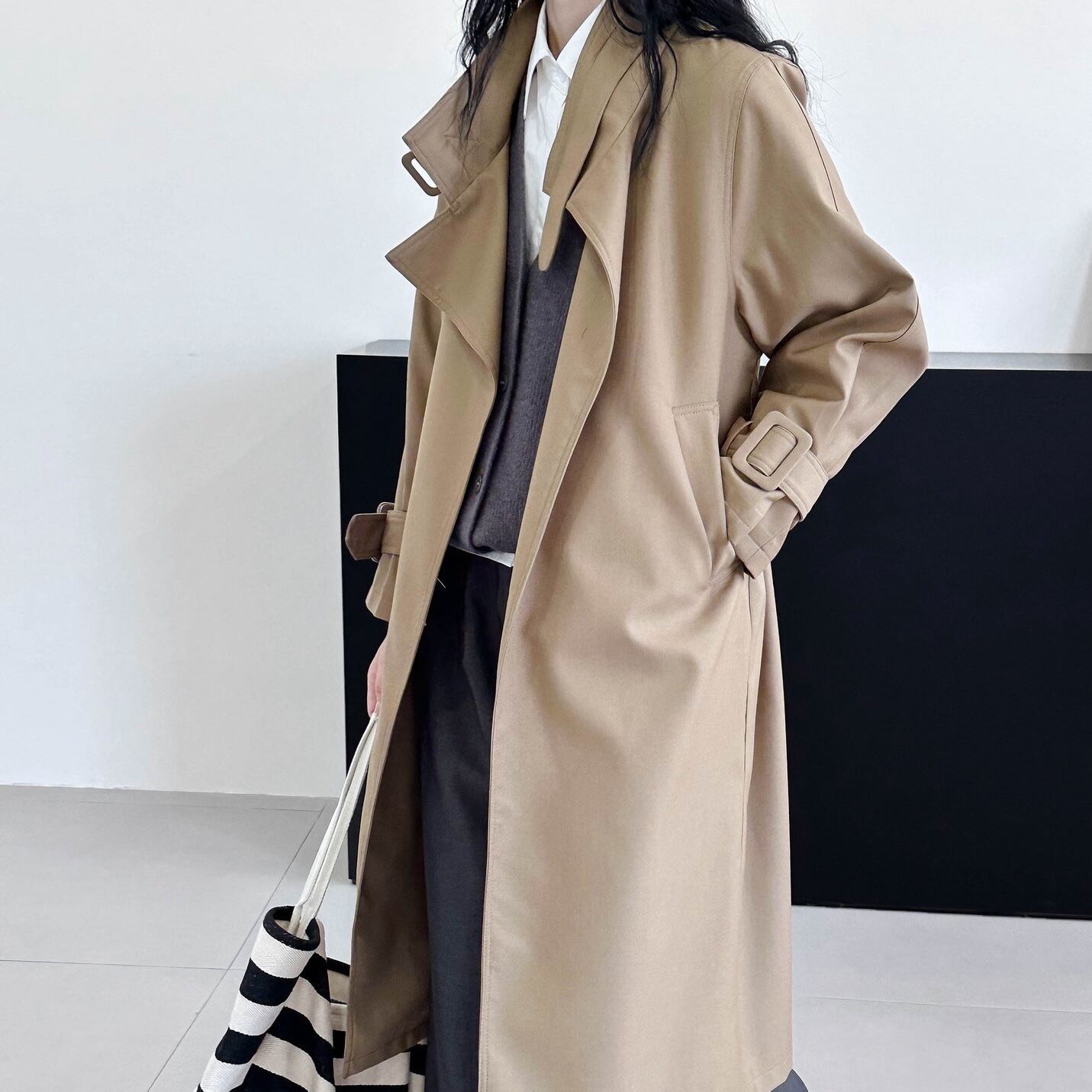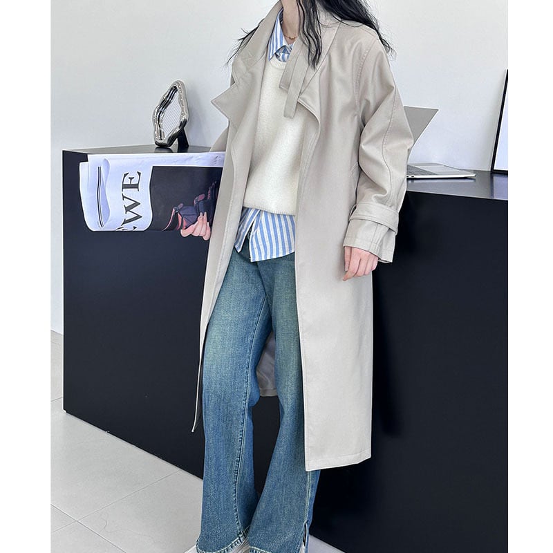 アウター 上着 コート トレンチコート 春 秋 冬 ひざ下 裾長め 長袖 襟付き ポケット 前開き ベルト ウエスト グレー ベージュ カーキグリーン 秋カラー 春カラー ニュアンスカラー 無地 M L オフィス 仕事 普段使い 美脚 脚長 お宅訪問 ベーシック ナチュラル モード系 清楚 かっちり 20代 30代 40代 同窓会