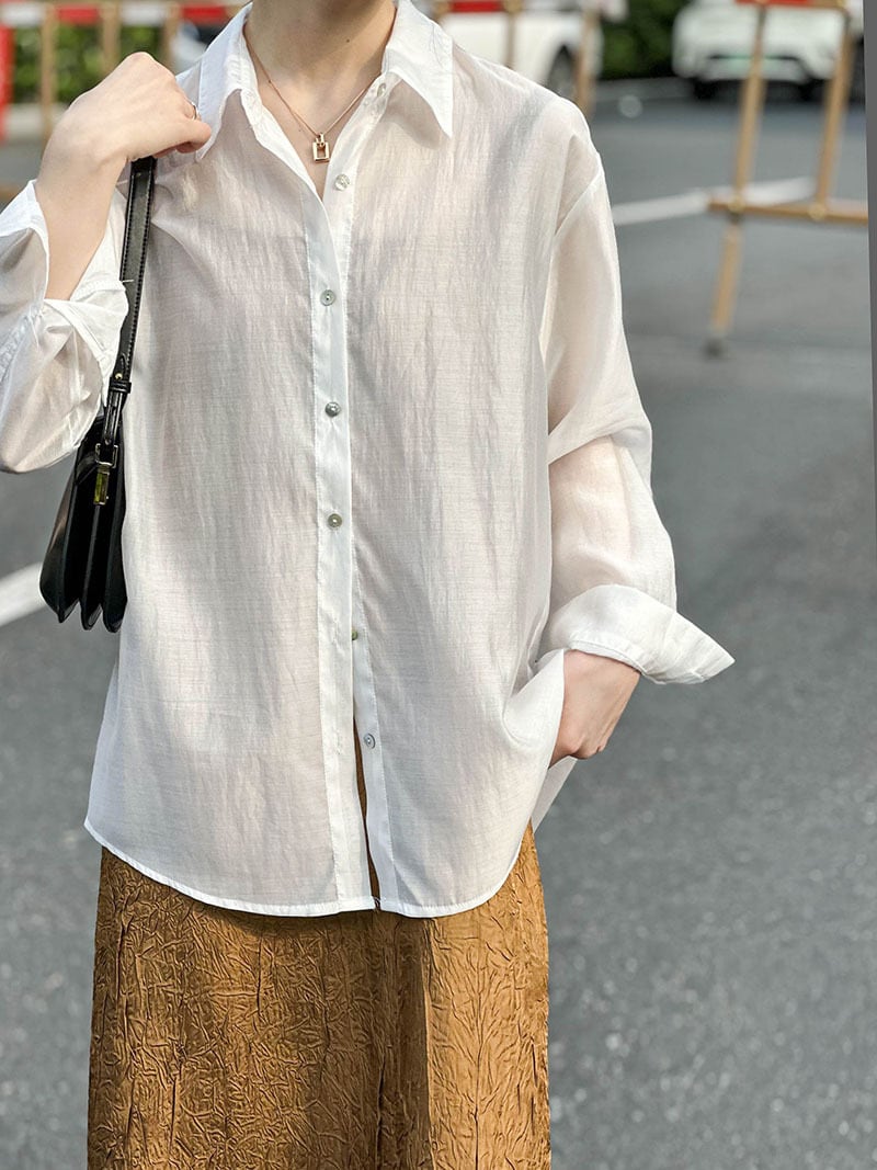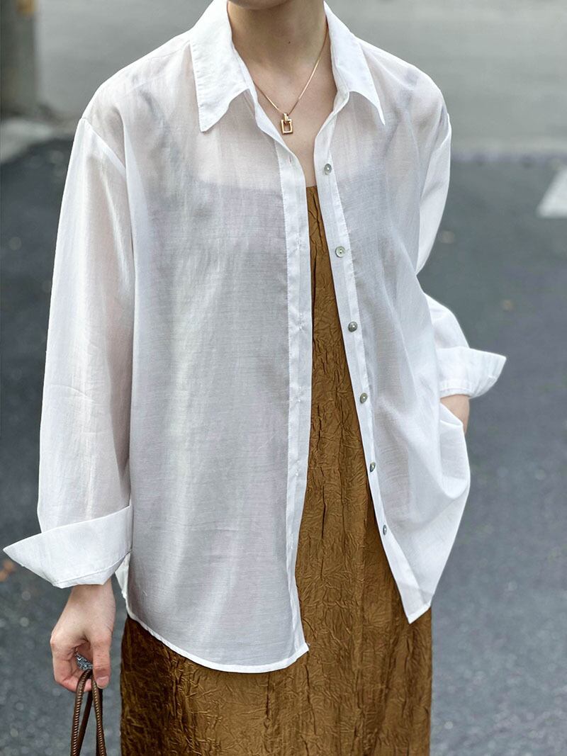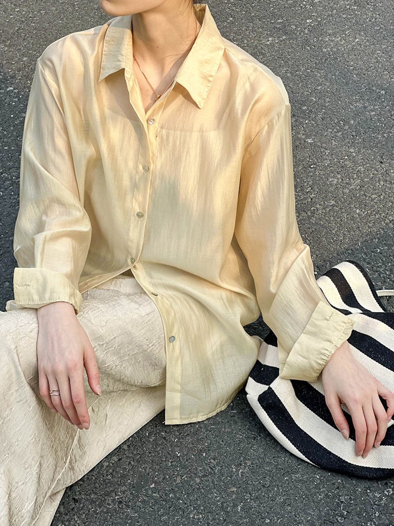 洗練された大人可愛いスタイルを演出するアイテム。襟付きデザインでオフィスやパーティー、イベントなど様々なシーンで活躍します。シースルーの透け感とツヤ感が女性らしい上品さを引き立て、薄手で軽やかな着心地は春夏秋の季節にぴったり。シンプルなデザインだからこそ、個性的なアクセサリーや小物と合わせやすく、こなれたスタイリングが楽しめます。洗練された女性らしさを演出する一枚をぜひお手に取ってみてください。