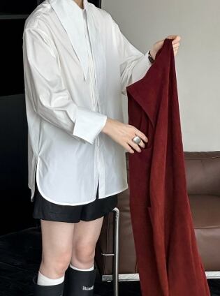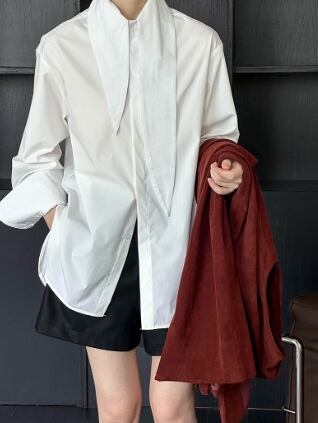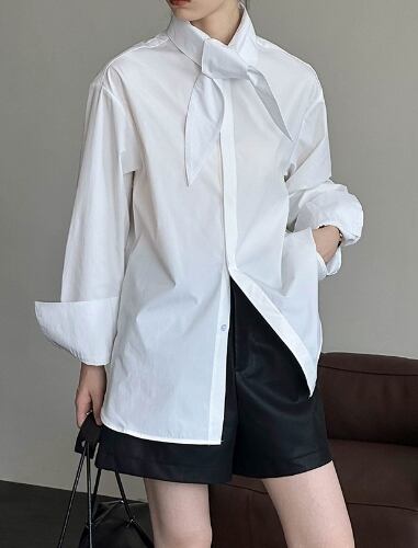 きれいなボウタイリボンがポイントのシャツ。裾長めでお尻やポッコリお腹もカバーしてくれるので、体型を気にせずスタイリッシュに着こなせます。オーバーサイズのデザインなので、ゆったりとした着心地が魅力です。ハリ感のある素材が、上品でモダンな印象を与えてくれます。お仕事やパーティー、イベント、旅行など、様々なシーンで活躍する一枚。ベーシックでシンプルなデザインなので、様々なスタイリングに合わせやすく、オールシーズン活躍すること間違いなしです。