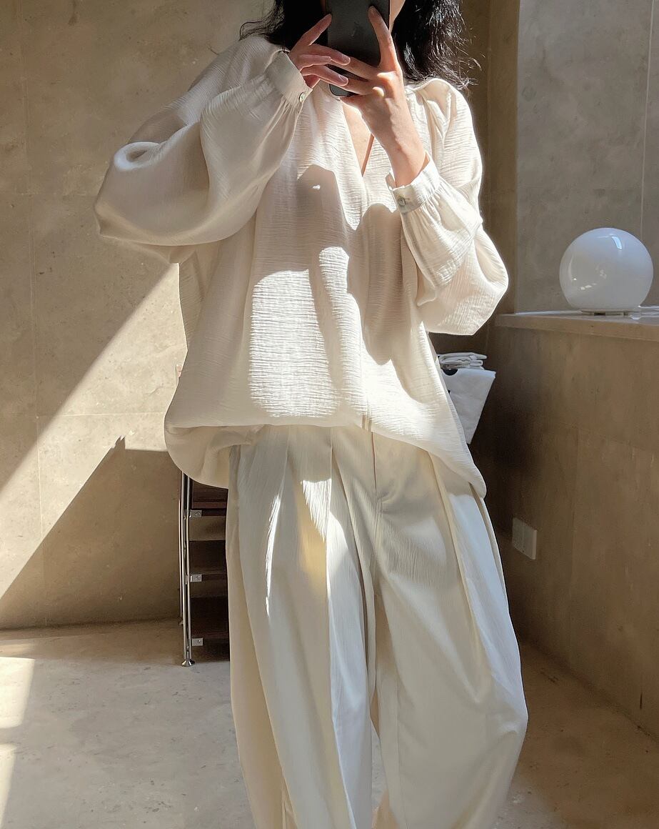 このトップスは、シーズンを問わず着回しの利くアイテムとしておすすめです。Vネックや襟なしデザインで、どんなボトムスとも合わせやすいのが魅力。バルーン袖がトレンド感を演出し、体型カバーにも一役買ってくれます。