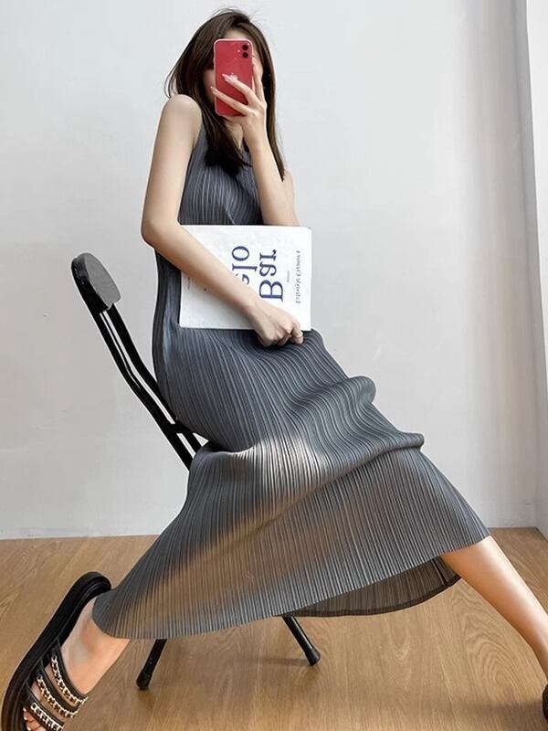 ワンピース ノースリーブ 春 夏 プリーツ ひざ下 ミモレ丈 スリム ブラック グレー アプリコット レッド ブルー 柄あり 総柄 フリーサイズ 学校 大学 イベント リゾート 旅行 海 プール ガーデン レストラン コンサート ライブ 外遊び 外出 スニーカーコーデ 普段使い 日常使い 美脚 脚長 着回し デイリー 合わせやすい 韓国 オルチャン 使いやすい ベーシック ナチュラル カジュアル ガーリー ラブリー エレガント きれいめ おしゃれ こなれ感 存在感 主役級 10代 20代 30代