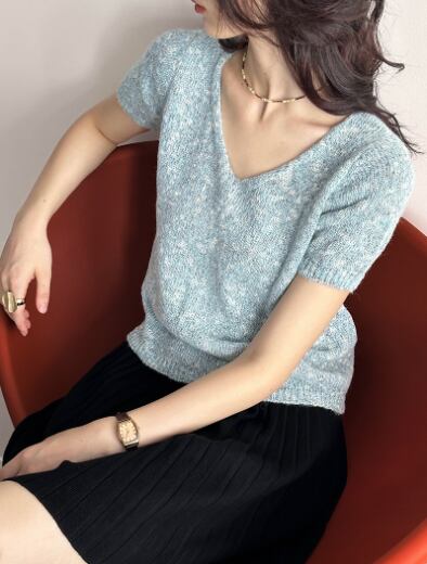 トップス ニット セーター 夏 秋 ショート丈 短丈トップス 半袖 Vネック タイト 細身 ストレート Iライン 編み込み ツイード ブルー ブラウン 無地 サマーニット モヘア オフィス 学校 大学 職場 高原 ホテル ガーデン レストラン コンサート カラオケ 外遊び 外出 仕事 普段使い 日常使い 楽ちん 着回し デイリー ベーシック シンプル ナチュラル カジュアル ガーリー コンサバ クラシカル クラシック レトロ ルーズ モダン かっこいい ボーイッシュ ラフ ワイルド 上品 大人可愛い 参観