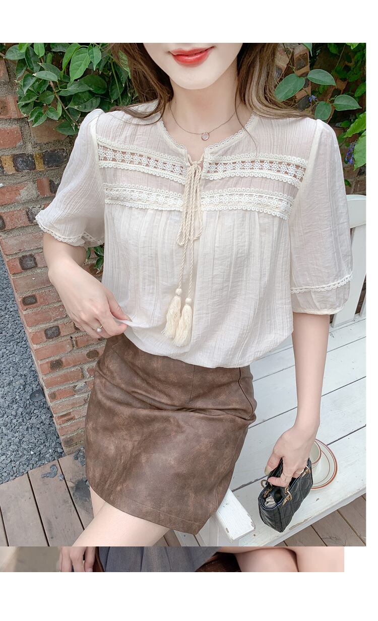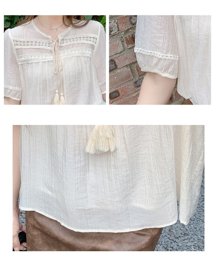 トップス シャツ ブラウス 白シャツ 春 夏 五分袖 ラウンドネック タッセル 透け感 アプリコット S M L XL LL 2XL 3L オフィス 学校 大学 イベント リゾート 旅行 海 ガーデン コンサート ライブ 体型カバー 1枚で決まる 普段使い 日常使い 楽ちん 着回し 合わせやすい ベーシック シンプル ナチュラル カジュアル かわいい キュート きれいめ フェミニン 清楚 おしゃれ こなれ感 抜け感 存在感 女っぽ 大人可愛い 華やか 爽やか 10代 20代 30代 お出かけ SNS 映え