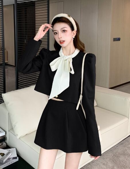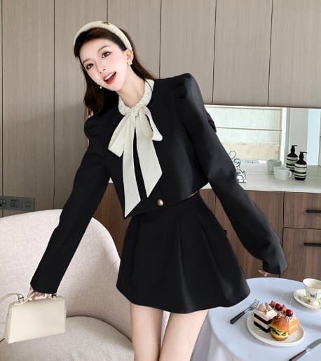 ジャケットとミニスカートの上下セットで、フェミニンな印象を演出します。ショート丈なのでハイウエストのスカートと相性抜群でノーカラーデザインなので、さまざまなトップスと合わせやすく、カジュアルからフォーマルまで幅広いシーンに対応します。ブラックやカーキグリーンなどの秋カラーがおすすめで、美脚効果も期待できるので抜群の着映えを叶えます。