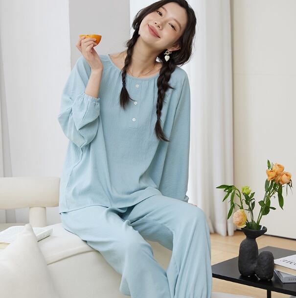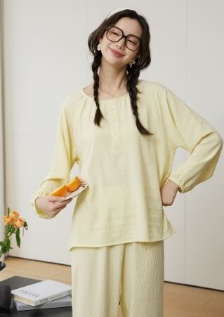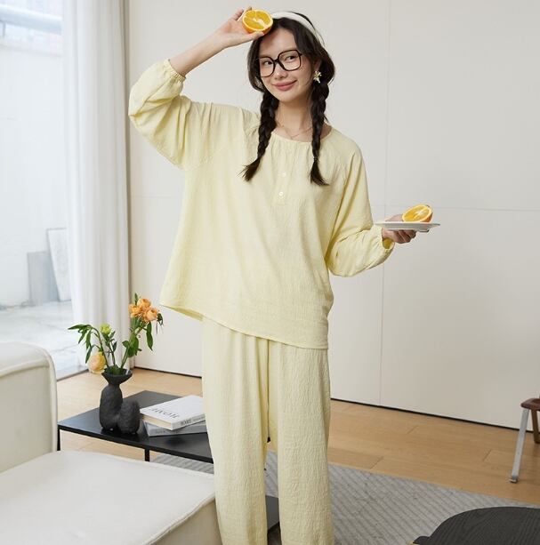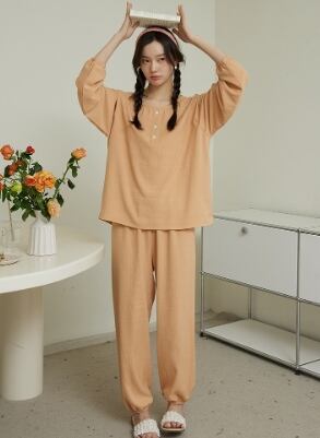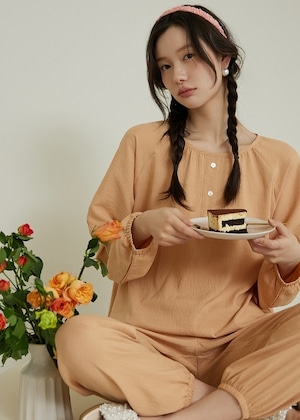 ルームウェア パジャマ 上下セット レディース 部屋着 寝巻き ナイトウェア 春 ミドル丈 長袖 ぽわん袖 ラウンドネック 襟なし ストレート オーバーサイズ ふっくら カラバリあり 緑 グリーン ピンク 藍色 ブルー オレンジ イエロー 無地 ゆったり フリーサイズ 旅行 体型カバー 普段使い 日常使い 楽ちん 定番 デイリー ベーシック シンプル ナチュラル カジュアル かわいい おしゃれ 抜け感 大人可愛い 爽やか 10代 20代 30代 40代 50代 お泊まり 休日 贈り物 プレゼント