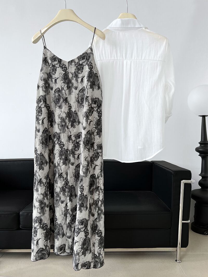 繊細なプリーツとシックな花柄が上品なフレアキャミソールワンピース。春夏秋のシーズンにぴったりなロング丈で、袖なしのデザインは腕の細さを強調し、Vネックがスッキリとした印象を与えます。ブラックベースの総柄は、大人っぽく落ちついた雰囲気を演出します。