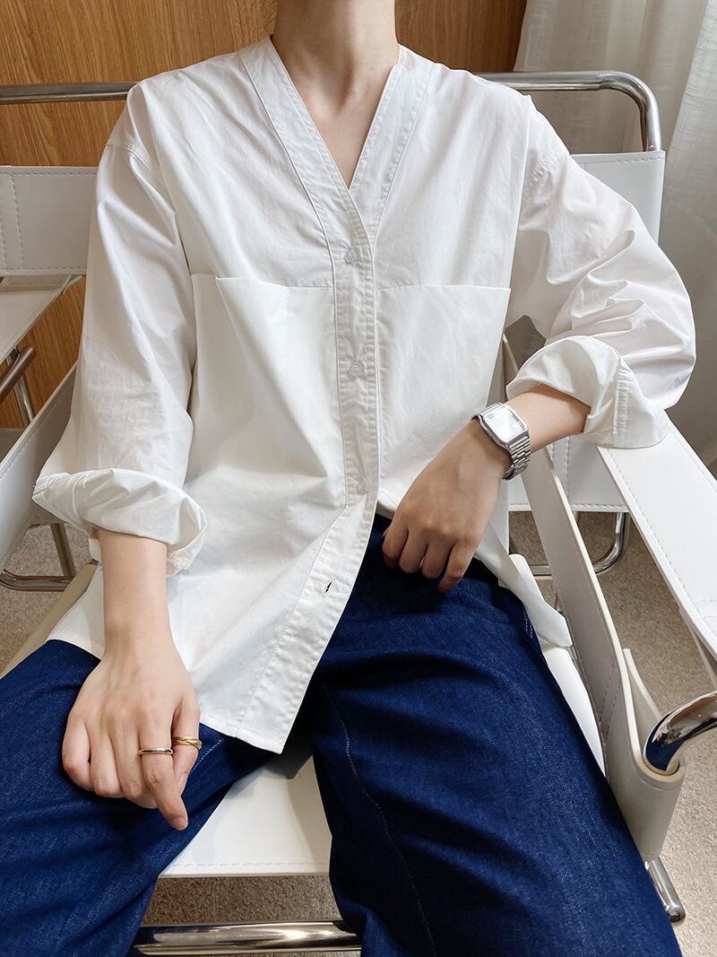 トップス シャツ ブラウス 白シャツ 春 夏 ロング丈 長袖 Vネック ホワイト ブルー 無地 M L 学校 バイト イベント リゾート ガーデン コンサート ライブ 外出 体型カバー 1枚で決まる 重ね着しやすい スニーカーコーデ 流行 トレンド 普段使い 日常使い 楽ちん 細見え 着痩せ 効果 着回し デイリー 合わせやすい ベーシック シンプル ナチュラル カジュアル かわいい キュート きれいめ ルーズ かっこいい メンズライク こなれ感 抜け感 存在感 大人可愛い 10代 20代 30代 40代