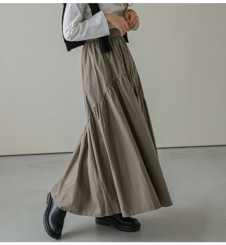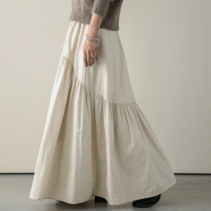 ウエストゴムがポイントのゆったりAラインシルエットが体型をきれいにカバーしてくるスカート。イレギュラーなギャザーが施され、ふんわりとしたラフなシルエットが魅力的。シーズンを問わず活躍する春秋冬のアイテムで、ヘビロテ必至の1枚です。ウエストゴムなので着心地も楽ちんで、体型カバーも叶えてくれる頼れるアイテム。スニーカーコーデからパンプスまで様々なスタイリングにマッチし、日常使いからイベントまで幅広く活躍します。存在感のある主役級アイテムとして、大人可愛いスタイリングを楽しんでください。
