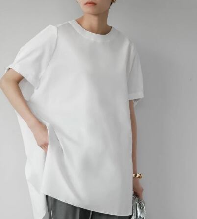 トップス レディース シャツ ブラウス 白シャツ 白トップス 夏 長丈トップス 裾長め お尻カバー 裾ワイド ポッコリお腹カバー 半袖 二の腕カバー パフスリーブ ラウンドネック ストレート BIGシルエット サイドスリット オーバーサイズ 落ち感 ふっくら ハリ感 カラバリあり ブラック 黒 ホワイト 白 無地 フリーサイズ リゾート 旅行 外出 1枚で決まる シンプル カジュアル モダン クール ラフ おしゃれ こなれ感 抜け感 爽やか 好感度 20代 30代 40代 50代 休日 デート お出かけ