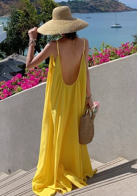 フレアシルエットが美しいビーチドレスです!明るいイエローが夏の装いを華やかに演出し、デコルテラインを綺麗に見せるデザインが印象的です。キャミソールスタイルの肌見せがこなれ感をプラスしてくれます。シフォン素材のふわふわ感と透け感があり、軽やかな落ち感があらゆるシーンでエレガントに決まります。