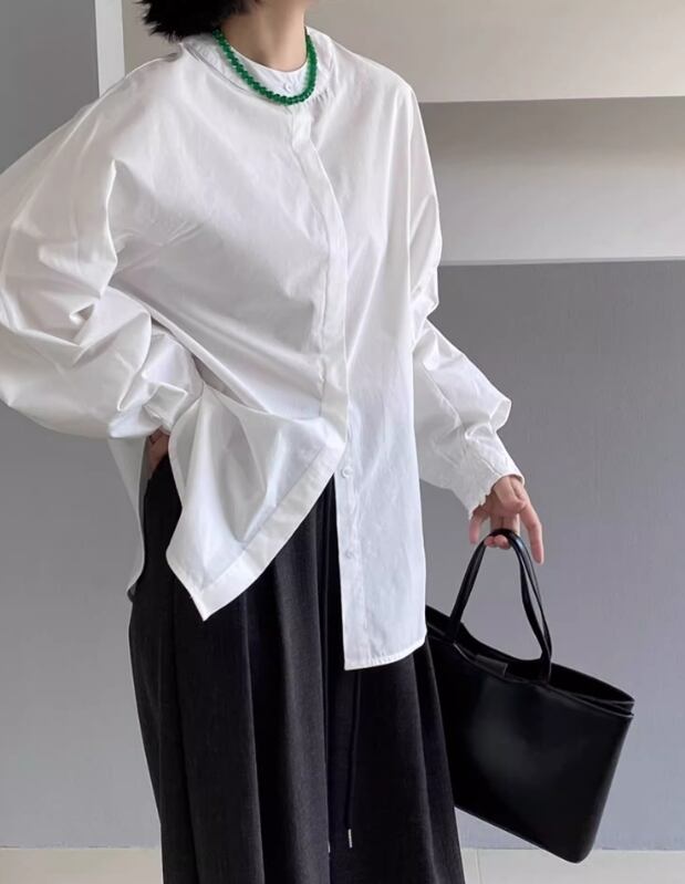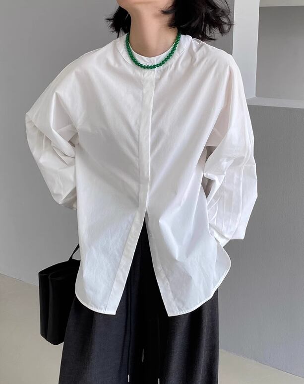 トップス レディース シャツ ブラウス 白シャツ 白トップス 秋 長丈トップス 裾長め お尻カバー 長袖 ノーカラー ストレート サイドスリット 前開き オーバーサイズ ハリ感 カラバリあり パープル 紫色 無地 S M オフィス 旅行 外出 仕事 体型カバー 重ね着しやすい 華奢見え 細見え 着回し 食事会 ご挨拶 ベーシック シンプル ナチュラル カジュアル きれいめ コンサバ モダン ラフ おしゃれ こなれ感 抜け感 爽やか 好感度 20代 30代 40代 50代 休日 デート お出かけ