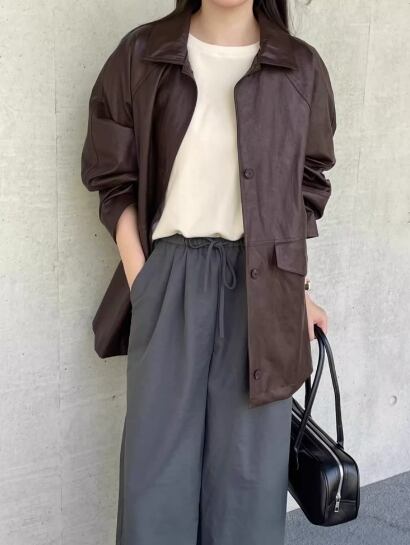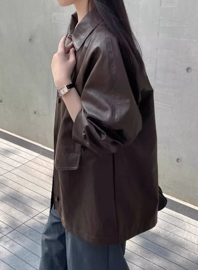 ストレートシルエットと丈感が体型を美しくカバーし、華奢見えを叶えます。襟付きデザインがカジュアルながらもきれいめな印象を与え、デートやお出かけに最適。また、シンプルなカラーリングのブラウンは、秋にぴったりで、多彩なコーディネートに合わせやすいアイテムです。オーバーサイズの形は、着心地も快適でこなれ感を演出します。