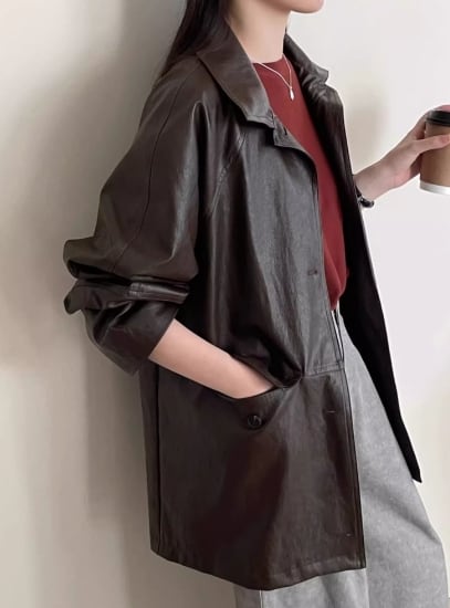 アウター レディース 上着 コート ジャケット シャンパー ステンカラー フェイクレザー レザー 秋 ミドル丈 長袖 襟付き ストレート 前開き オーバーサイズ  落ち感 ハリ感 ブラウン 茶色 秋カラー M L 旅行 外出 体型カバー 楽ちん 華奢見え 着回し 合わせやすい 使いやすい 暖かい 食事会 シンプル カジュアル きれいめ レトロ マニッシュ モダン クール かっこいい メンズライク ラフ おしゃれ こなれ感 抜け感 上質 高級感 20代 30代 40代 50代 デート お出かけ