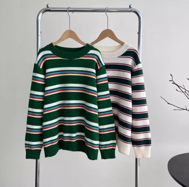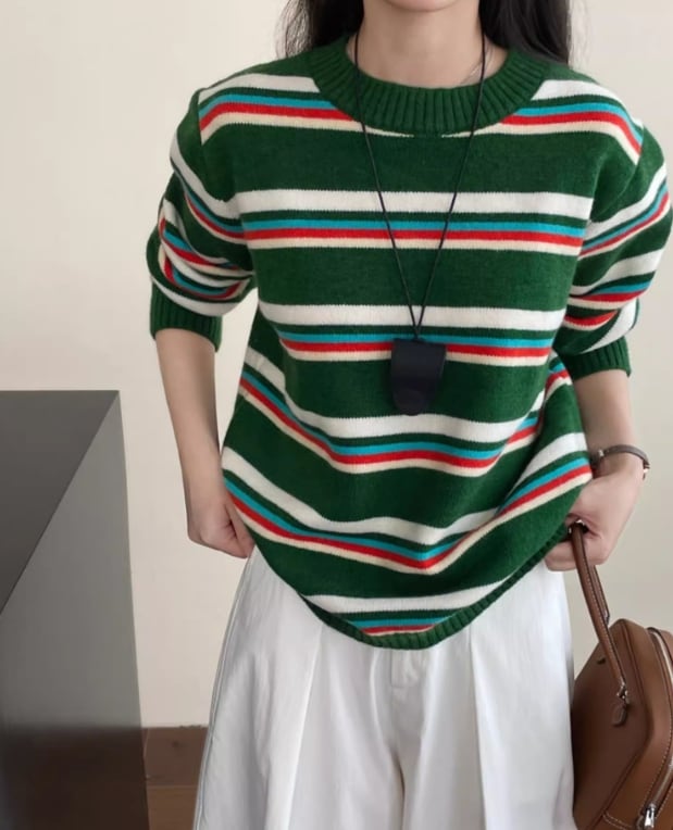 トップス レディース ニット セーター プルオーバー 秋 普通丈トップス 長袖 ラウンドネック ストレート ふっくら 伸縮性 カラバリあり 緑 グリーン ストライプ ボーダー フリーサイズ 旅行 カラオケ 外出 体型カバー 普段使い 日常使い 華奢見え 着痩せ 効果 定番 着回し 合わせやすい 使いやすい 暖かい ベーシック シンプル ナチュラル カジュアル かわいい ラフ おしゃれ こなれ感 抜け感 大人可愛い 華やか 爽やか 好感度 10代 20代 30代 40代 50代 休日 デート お出かけ