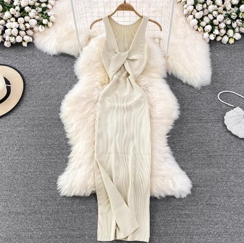 ノースリーブのニットワンピースはカジュアルながらもきれいめな印象を与え、大人可愛いスタイルを演出します。