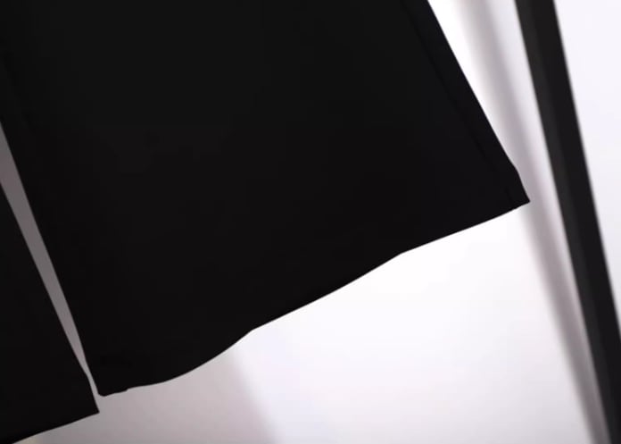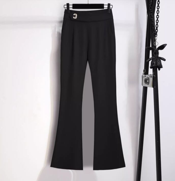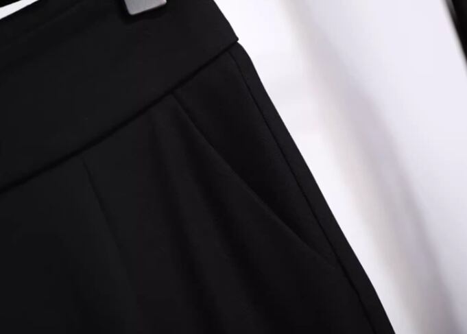 ハイウエストデザインが脚長効果を引き出し、落ち感のあるブラックの生地が上品さを演出します。