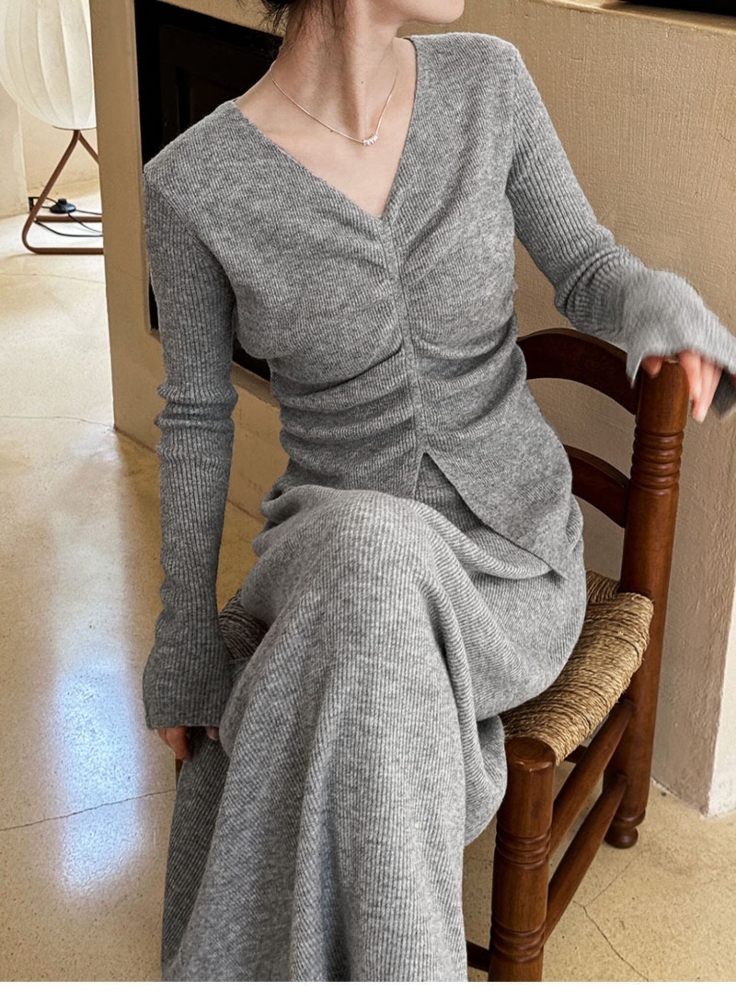 トップス スカート レディース 2点セット ニット セーター ロングスカート 秋 普通丈トップス 長袖 Vネック 襟なし デコルテきれい スリム タイト 細身 グレー アプリコット ダークグレー 無地 フリーサイズ 普段使い 日常使い 楽ちん 細見え 若見え 高見え 格上げ 合わせやすい 人とかぶらない 使いやすい モテ ベーシック シンプル ナチュラル カジュアル ラフ おしゃれ こなれ感 存在感 主役級 上品 上質 好感度 20代 30代 40代 お迎えコーデ お出かけ インスタ映え SNS 映え