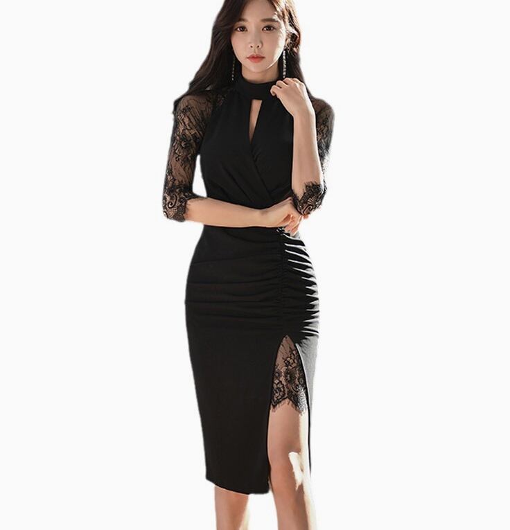ワンピース レディース 個性的 春 夏 ひざ丈 七分袖 襟なし スリム タイト 細身 肌みせ レース サイド 横 ブラック 無地 S M L XL LL パーティー イベント 1枚で決まる 美脚 脚長 華奢見え 細見え 若見え 高見え 格上げ コーディネートしやすい スタイルアップ メンズウケ 人とかぶらない モテ ベーシック シンプル ナチュラル ガーリー キュート ラブリー セクシー おしゃれ こなれ感 存在感 主役級 女っぽ 大人可愛い 華やか 高級感 20代 30代 デート お出かけ