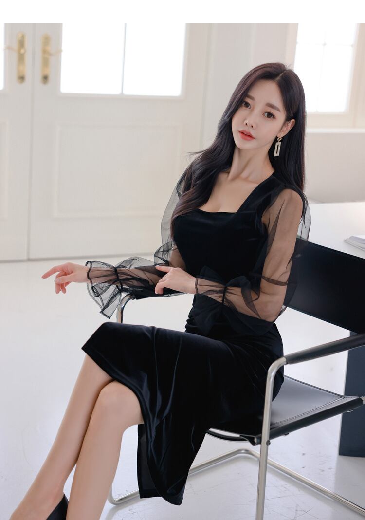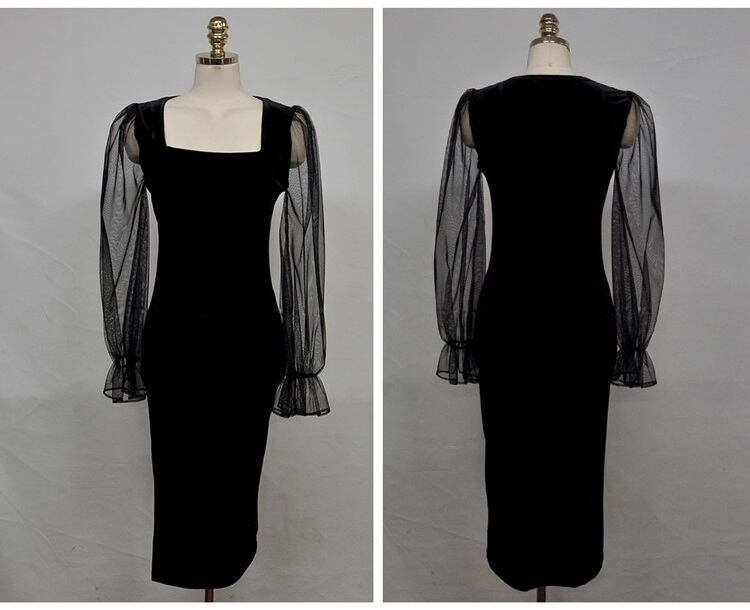 シアー袖 ワンピドレス ワンピース レディース 春 秋 ひざ下 長袖 スクエアネック 襟なし スリム タイト 細身 サイドスリット ブラック 無地 S M L XL LL パーティー イベント 1枚で決まる 細見え 着痩せ 効果 若見え 高見え 格上げ 合わせやすい モテ ベーシック シンプル ナチュラル エレガント セクシー モード系 モダン クール ラフ おしゃれ こなれ感 存在感 主役級 上品 大人可愛い 上質 好感度 高級感 20代 30代 40代 デート お出かけ SNS 映え 写真 映え