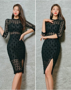 ワンピース レディース 個性的 春 秋 ひざ丈 七分袖 襟なし スリム タイト 細身 サイドスリット 透け感 ブラック 無地 S M L XL LL パーティー イベント 美脚 脚長 華奢見え 細見え 着痩せ 効果 若見え 高見え 格上げ 人とかぶらない モテ ベーシック シンプル ナチュラル カジュアル エレガント きれいめ セクシー おしゃれ こなれ感 存在感 主役級 大人可愛い 華やか 上質 セレブ 好感度 高級感 20代 30代 40代 セレモニー デート お出かけ SNS 映え 写真 映え