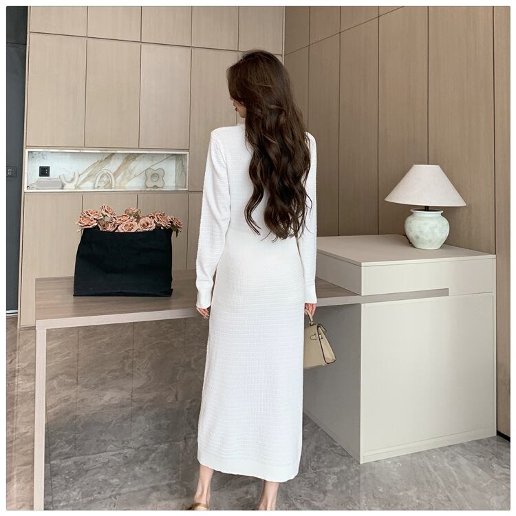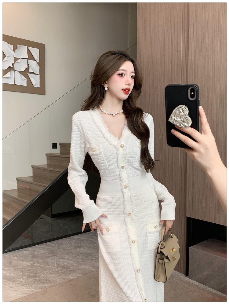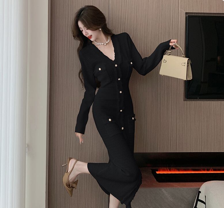 ワンピース レディース 個性的 秋 冬 ミモレ丈 長袖 Vネック スリム タイト 細身 カラバリあり ブラック ホワイト 無地 S M L パーティー  式典 イベント 1枚で決まる 美脚 脚長 華奢見え 細見え 若見え 高見え 格上げ 人とかぶらない モテ ベーシック シンプル ナチュラル エレガント きれいめ セクシー フェミニン おしゃれ こなれ感 抜け感 存在感 主役級 女っぽ 大人可愛い 上質 セレブ  高級感 20代 30代 40代 セレモニー インスタ映え SNS 映え 写真 映え