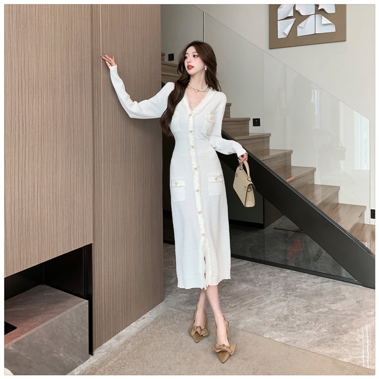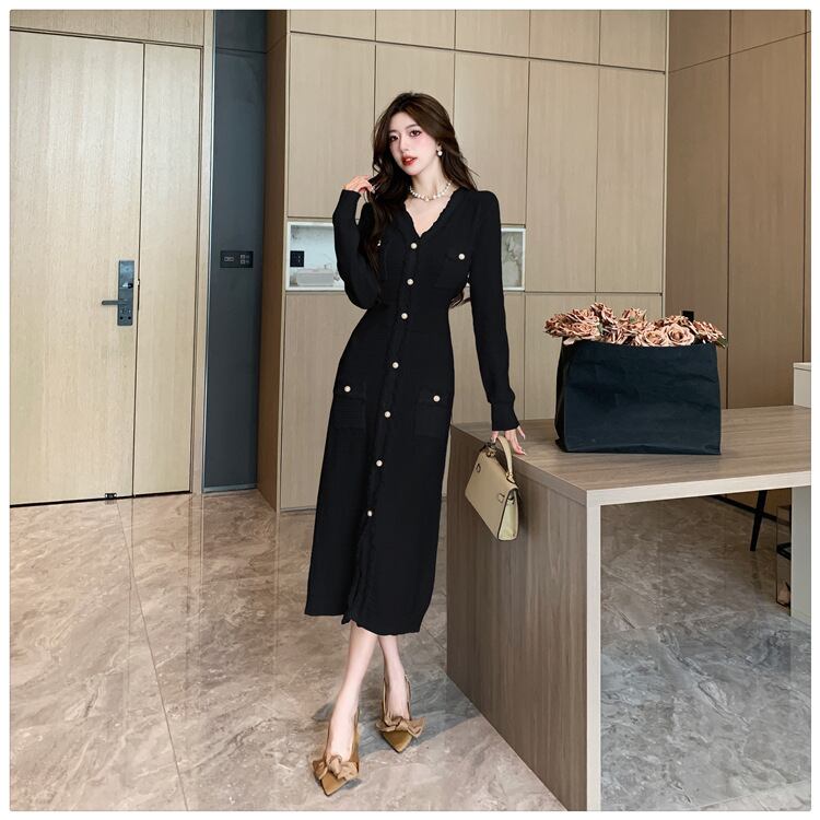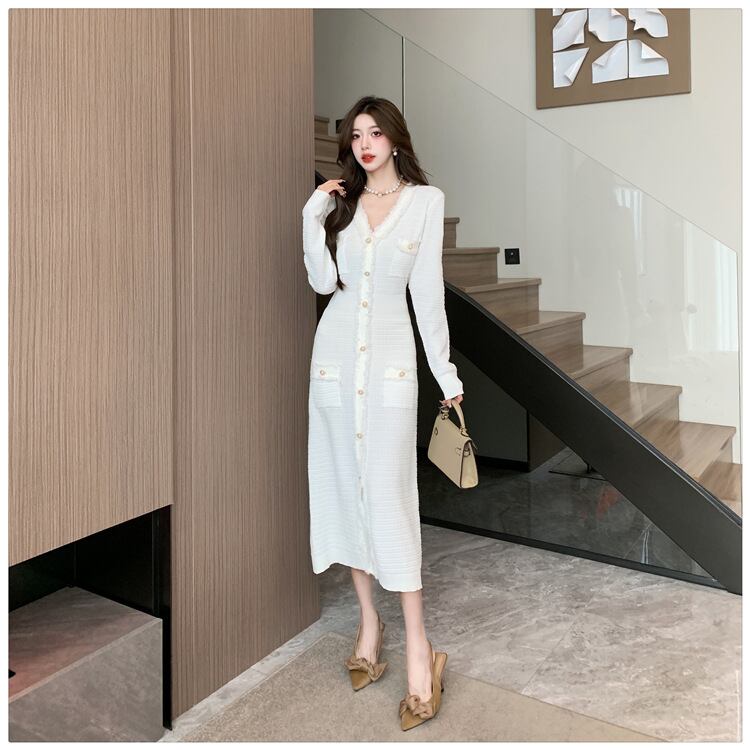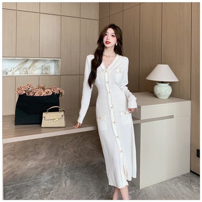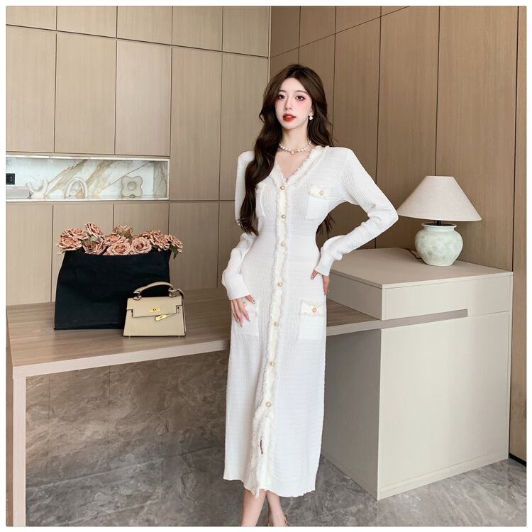 Vネックで魅せる大人の品格、秋冬の主役級ミモレ丈ワンピース。