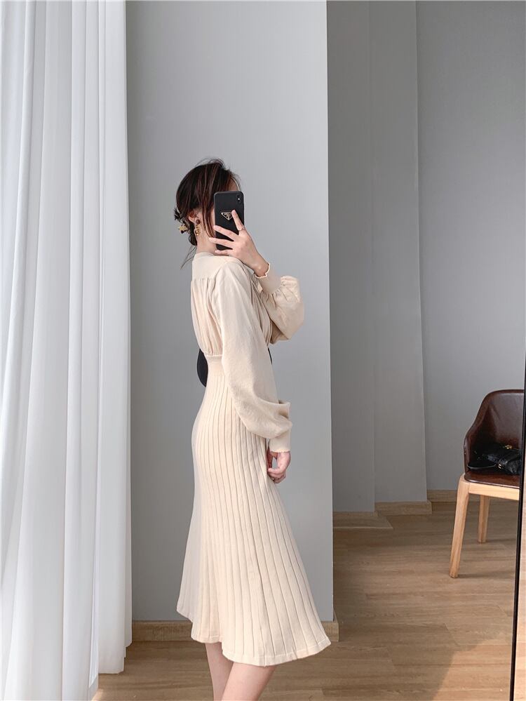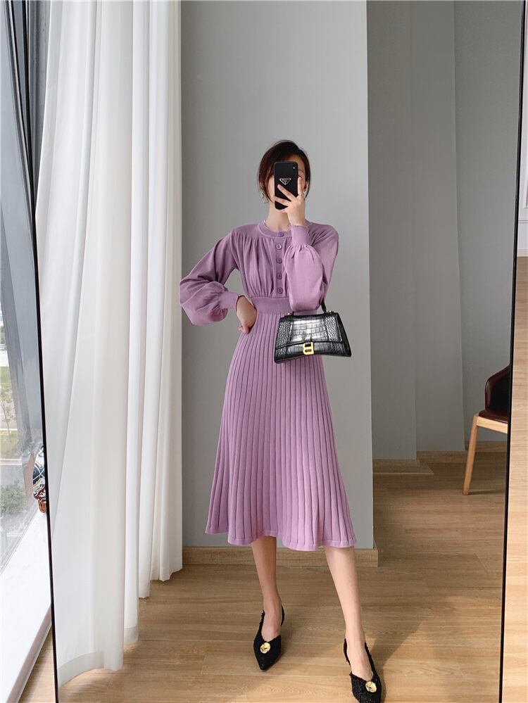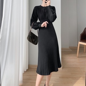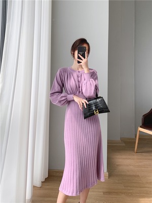 ニット ワンピース レディース 秋 冬 ひざ下 長袖 クルーネック 丸首 襟なし Aライン ウエストマーク 切り替えデザイン ブラック アプリコット パープル 無地 S M L XL パーティー イベント 1枚で決まる 美脚 脚長 細見え 若見え 高見え 格上げ スタイルアップ モテ ベーシック シンプル ナチュラル エレガント おしゃれ こなれ感 抜け感 存在感 主役級 女っぽ 上品 上質 セレブ 好感度 高級感 30代 40代 デート お出かけ インスタ映え SNS 映え