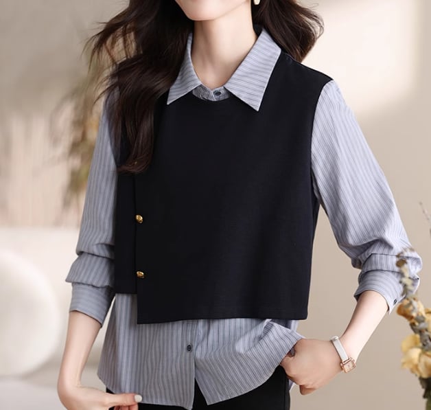 トップス フェイクツーピース シャツ ニット 柄シャツ 春 秋 ミディアム丈 普通丈トップス 長袖 襟付き ポロカラー スリム 切り替えデザイン 伸縮性 ボタン 重ね着 ネイビー ブルー 縞模様 ストライプ S M L XL LL 2XL 3L 異素材MIX オフィス 学校 大学 職場 1枚で決まる プチプラ 高見え 格上げ デイリー スタイルアップ 発表会 食事会 お宅訪問 ご挨拶 きれいめ コンサバ かっちり かっこいい おしゃれ こなれ感 20代 30代 40代 幼稚園ママ 授業参観 初対面 婚活