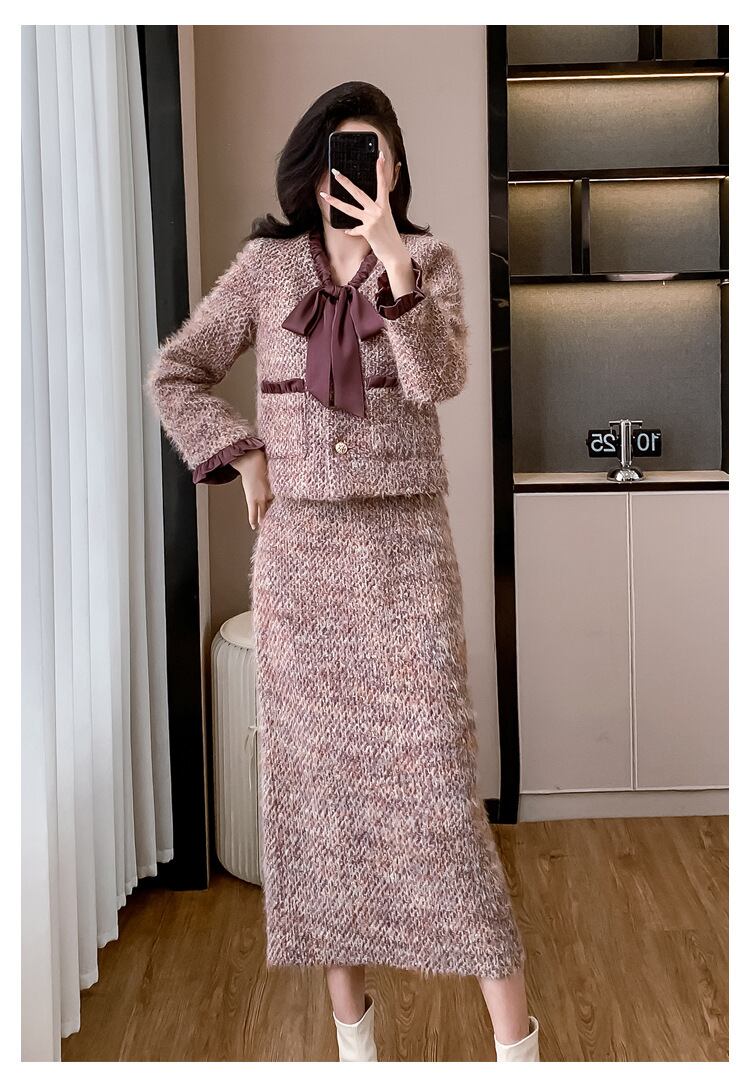 ジャケット ロングスカート セットアップ 上下セット レディース 2点セット 個性的 秋 冬 長袖 胸元リボン スリム ストレート カラバリあり ブラウン パープル S M L XL ウール パーティー イベント 美脚 脚長 華奢見え 細見え 若見え 高見え 格上げ エレガント きれいめ フェミニン かっちり おしゃれ こなれ感 デキる女風 存在感 主役級 女っぽ 上品 大人可愛い 華やか 上質 セレブ 爽やか 好感度 派手 高級感 20代 30代 40代 セレモニー デート お出かけ SNS 映え
